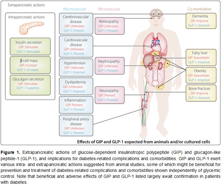 糖尿病による大血管障害(虚血性心疾患、脳血管疾患、末梢動脈性疾患)に対して、インクレチンの有益な作用が示唆されている。GLP-1は心筋細胞のアポトーシスを抑制するほか、心筋の代謝を是正して虚血心の心機能を改善するがそのメカニズムについてはなお不明な点もある。またGLP-1は脳虚血後に酸化ストレスや神経細胞死を抑制するため梗塞巣を大幅に縮小する。さらにGLP-1は脂質異常や高血圧を是正すると共に免疫細胞に作用して慢性炎症を是正、動脈硬化進展を抑制する。また糖尿病による細小血管障害(神経障害、網膜症、腎症)に対しても、インクレチンの有益な作用が示唆されている。さらに、糖尿病の併存症(認知症、肥満、脂肪肝、骨折)に対しても、インクレチンの関与が報告されている。GIPは、高脂肪負荷時にインスリンと協調して脂肪蓄積を促進するため肥満を助長する可能性がある。また、GIPは骨芽細胞に作用して骨形成を促し、破骨細胞による骨吸収を抑制する。GLP-1は齧歯類ではカルシトニンを介して骨吸収を抑制する。