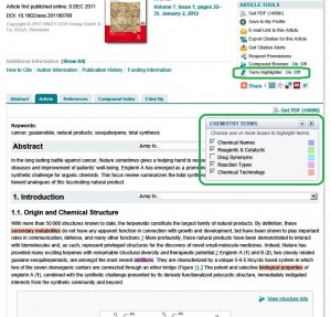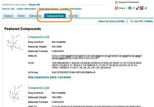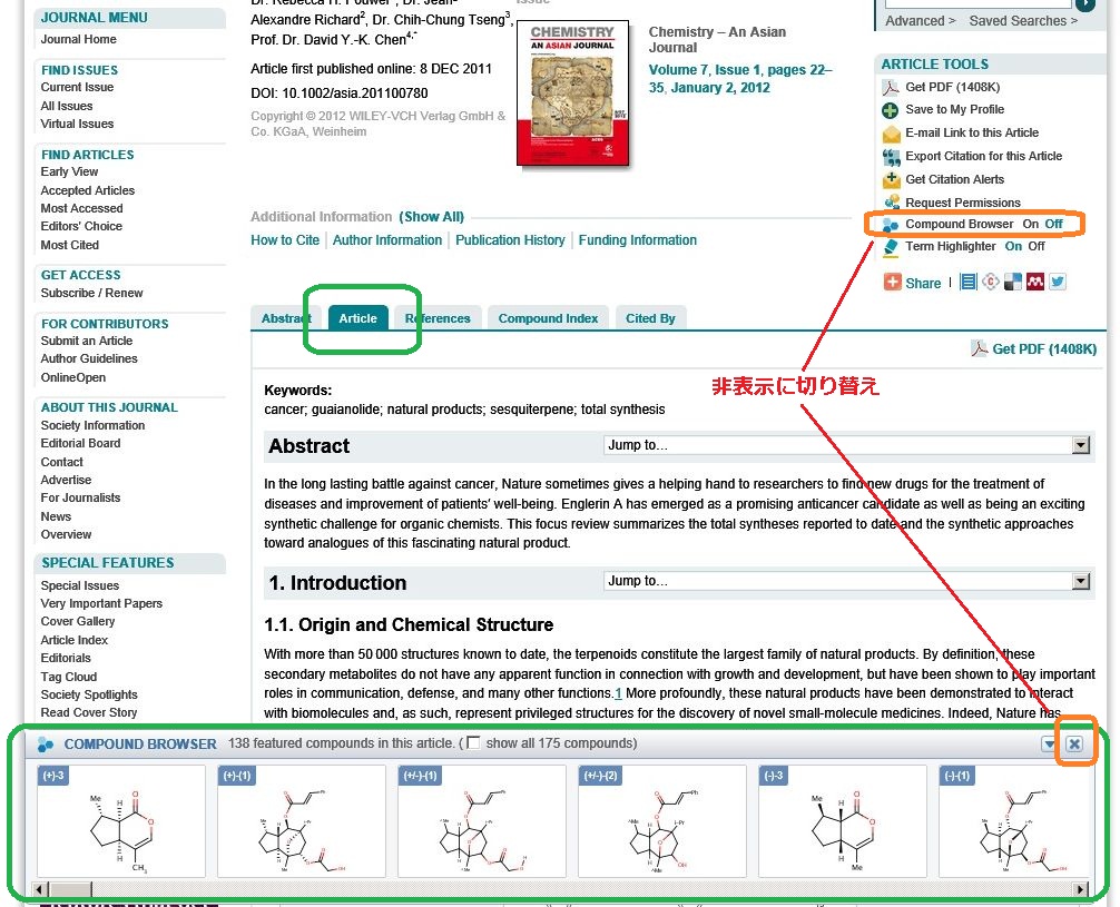 Articleタブをクリックして、本文HTMLに移動して下さい。画面の最下部に、Featured Compoundsの一覧が表示されます。どれか一つをクリックすると、本文の該当箇所がハイライト表示されます。Compound Browserを非表示にするには、x印をクリックするか、画面右上のArticle Toolsメニュー中の、Compound Browserの項目をOffに切り替えて下さい。