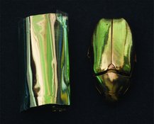 このほどヒューレット・パッカード社研究所の研究グループは、このレスプレンデンスが光沢を放つ仕組みを液晶ポリマーを使って模倣し、高反射フィルムとして製造することに成功、Advanced Materials誌に論文として発表しました。右の写真は、一方が本物のレスプレンデンス、もう一方が人工的なフィルムですが、形をよく見ないと区別がつかないくらいそっくりですね。