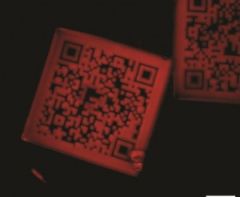 マイクロタガントに製造業者・製品名・製造ロット番号などの情報を書き込む方法としては、これまで文字やバーコードが使われてきましたが、盛り込める情報量が少ない、またコードが損傷して読めなくなるなどの問題がありました。このほど韓国ソウル国立大学の研究グループは、高分子材料と蛍光モノマーを使って、QRコードを埋め込んだマイクロタガントを製造することに成功、Advanced Materials誌で報告しました(右上が表紙画像)。蛍光顕微鏡で見るとQRコードが浮かび上がり(右写真)、携帯電話などに使われているのと同じリーダーアプリで情報を読み取ることができます。