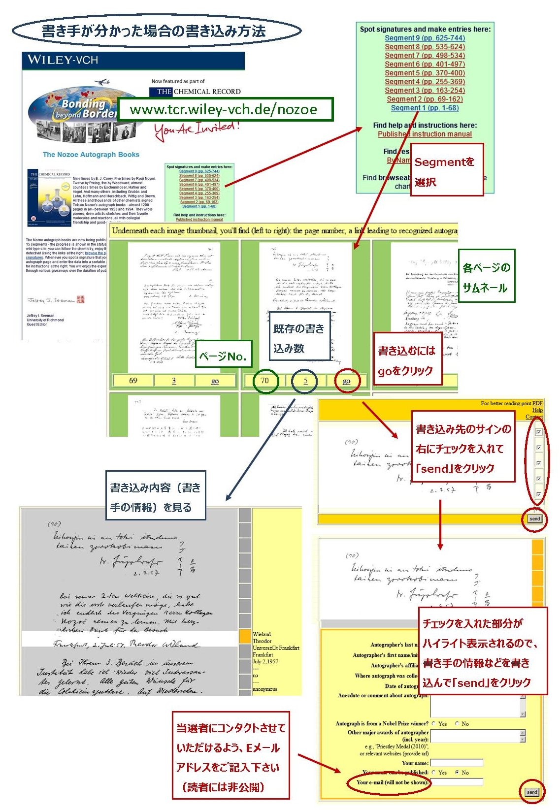 サインの書き手探しに興味のある方や、まずは一度サイン帳を見てみようという方は、サイン帳復刻企画の特設ページ http://www.tcr.wiley-vch.de/nozoe/ から、下図の要領で閲覧・書き込みいただけます。(本日27日から開催の日本化学会春季年会で、Wiley展示ブースでもご案内しています。)